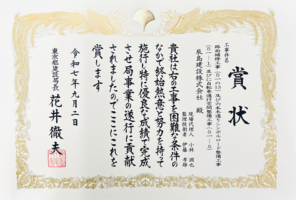 受賞内容:建設局優良工事及び建設局 HTT ゼロエミッション優良取組工事